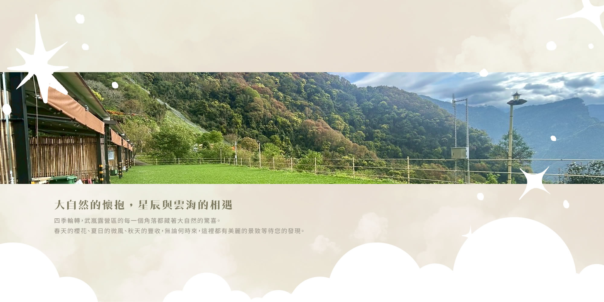 在武嵐露營區,我們希望為每一位旅人打造一處遠離都市喧囂、回歸純粹山林的寧靜角落。無論是與親友共度美好時光,還是獨自來場心靈放空的旅程,這裡都將是您最理想的選擇。